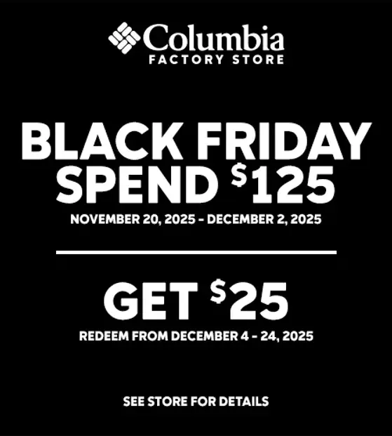 Get a $25 Columbia promotional gift card when you spend $125 between November 20th and December 2nd, 2025. Find the perfect gift for everyone on your list at your local Columbia store, from cozy fleece and snow boots to must have accessories and the warmest jackets.